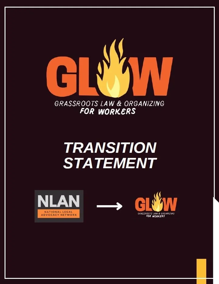 News & EventsKeep Up to Date announcement Lorraine Sands 1/11/24 announcement Lorraine Sands 1/11/24 Transition Statement: NLAN to GLOW Read More announcement Lorraine Sands 8/4/23 announcement Lorraine Sands 8/4/23 Victory: Illinois Temp Worker Fairness & Safety Act Signed Into Law Read More announcement Lorraine Sands 6/16/23 announcement Lorraine Sands 6/16/23 Ensuring Equal Employment Opportunity: The Upcoming Supreme Court Affirmative Action Decisions and the Workplace Read More announcement Lorraine Sands 6/15/23 announcement Lorraine Sands 6/15/23 Labor-Based Deferred Action Clinics with Chicago Workers Collaborative Read More announcement Lorraine Sands 12/6/22 announcement Lorraine Sands 12/6/22 NLAN Executive Director Sheila Maddali Selected as 2022 Echoing Green Fellow Read More announcement Lorraine Sands 8/2/22 announcement Lorraine Sands 8/2/22 NLAN's Executive Director Sheila Maddali: Echoing Green Finalist Read More announcement Lorraine Sands 2/28/22 announcement Lorraine Sands 2/28/22 Announcing BLACK, Initiative by National Black Worker Center & National Legal Advocacy Network Read More Join our mailing list to receive updates, news, and opportunities to get involved. First Name Last Name Email Address Sign Up We respect your privacy. Thank you!